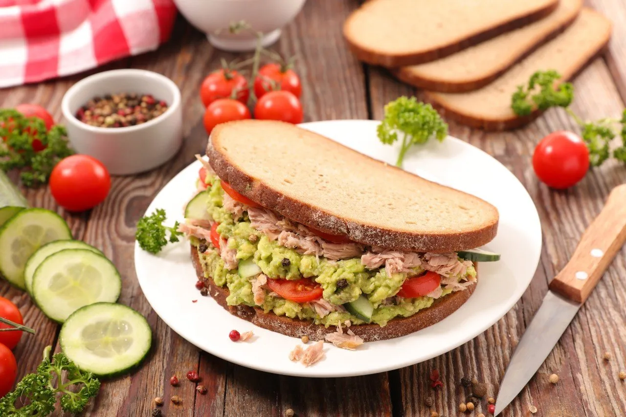 Tartinez la moitié du mélange sur une tranche de pain complet. Ajoutez les lamelles d’avocat et la laitue ciselée. Tartinez le reste de la préparation au thon sur la seconde tranche de pain et refermez le sandwich.