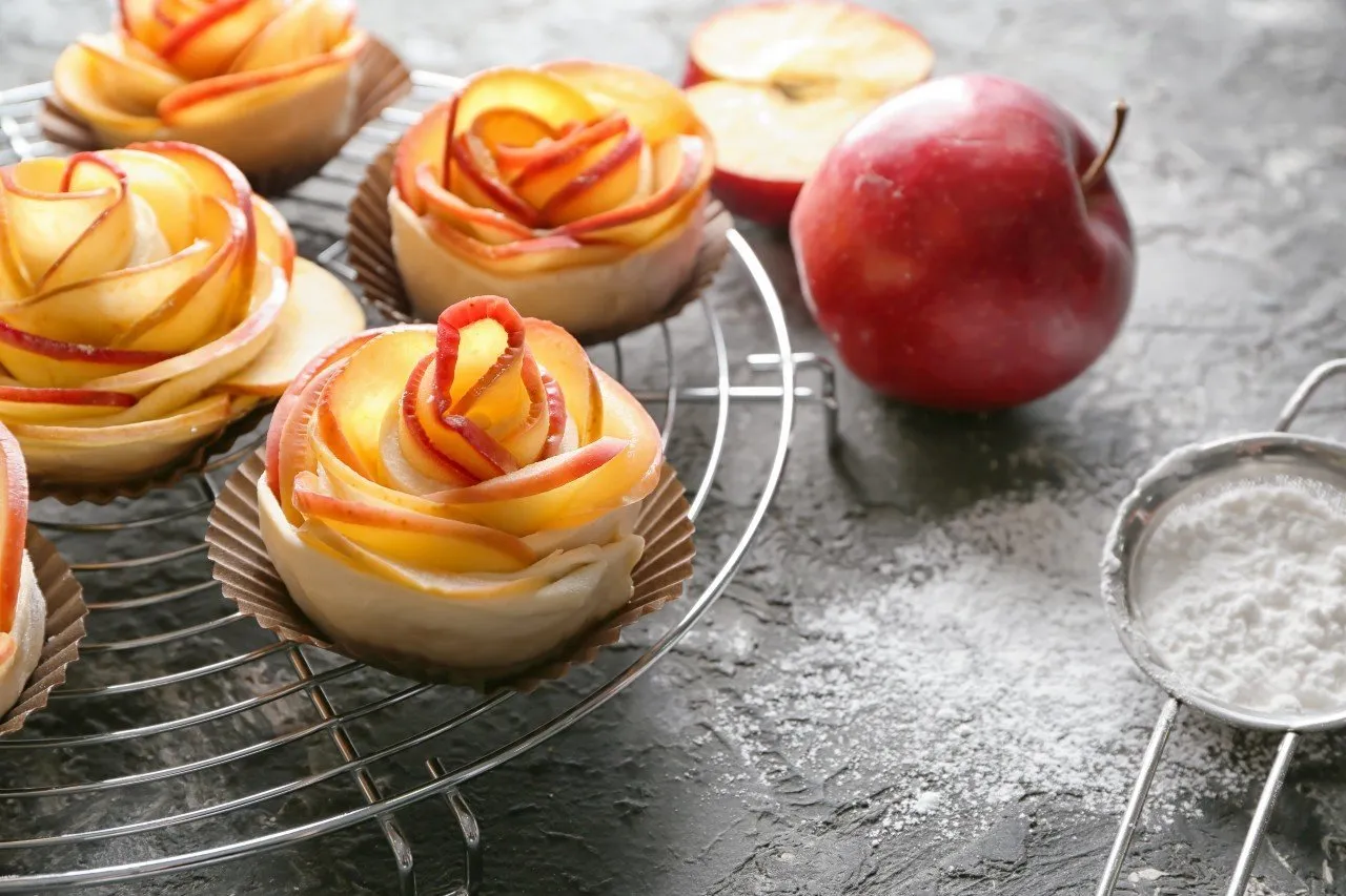 Préchauffez le four à 200 °C. Épluchez les pommes, ôtez le trognon et coupez-les en tranches. Disposez ces dernières en rosace dans le fond d’un moule en silicone.