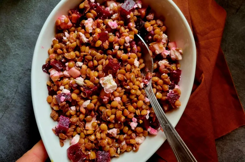 Mélangez les lentilles tièdes avec la betterave, la feta et les noix. Ajoutez la roquette et assaisonnez. Servez à température ambiante.