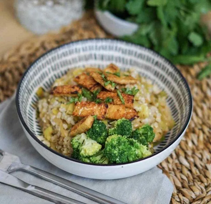 - Enfin, rassemblez dans votre assiette, le risotto aux poireaux, les brocolis et le tempeh.