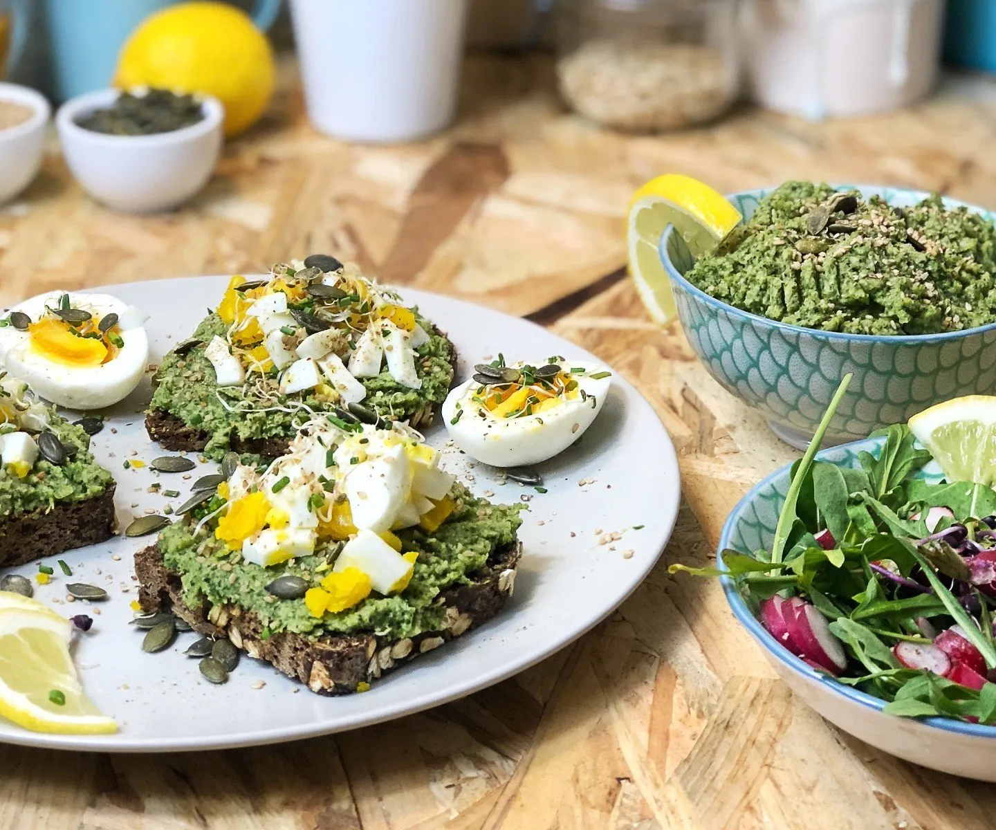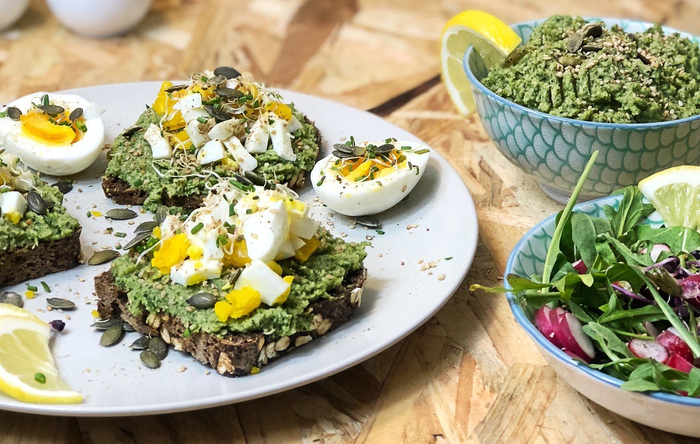 Après avoir enlevé la coquille de vos œufs, coupez-les en petits morceaux et répartissez-les sur vos tartines. Vous pouvez également ajouter quelques graines germées, graines de courge, ciboulette émincée et gomasio.