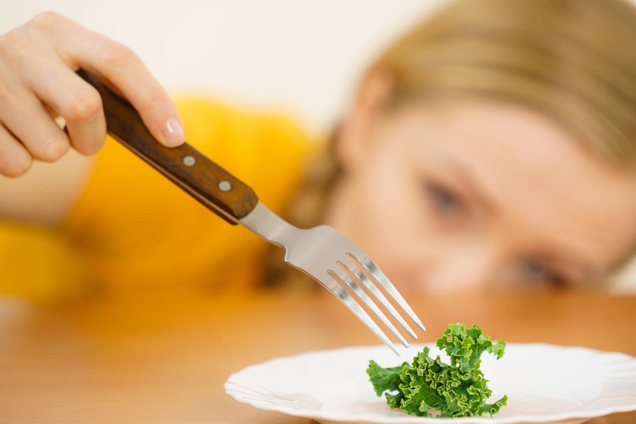 sad young blonde woman dealing with anorexia nervosa or builimia having small green vegetable on plate dieting problems, eating disorder