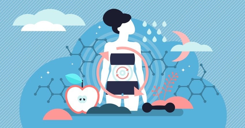metabolism vector illustration flat tiny food to energy conversion persons concept tiny nutrition chemical reactions in organism synthesis abstract digestive tract and biochemistry symbols process