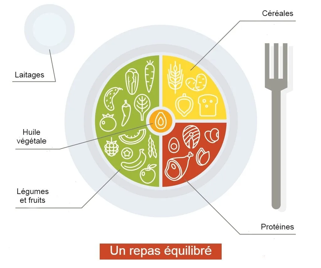 Pour rappel, un repas équilibré se compose d’une belle portion de légumes (au moins 50 % de l’assiette), accompagnée d’une protéine (viande, poisson, œuf ou légumineuses) et d’un féculent de préférence complet (riz, pâtes, boulgour, pain…) et d’une cuillère à soupe de matière grasse. Il peut se terminer par un laitage nature, un fruit ou une compote. N’oubliez pas, également, de boire beaucoup d’eau tout au long de la journée.