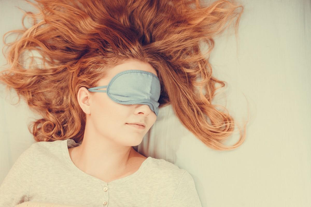 tired woman sleeping in bed wearing blindfold sleep mask young girl taking nap