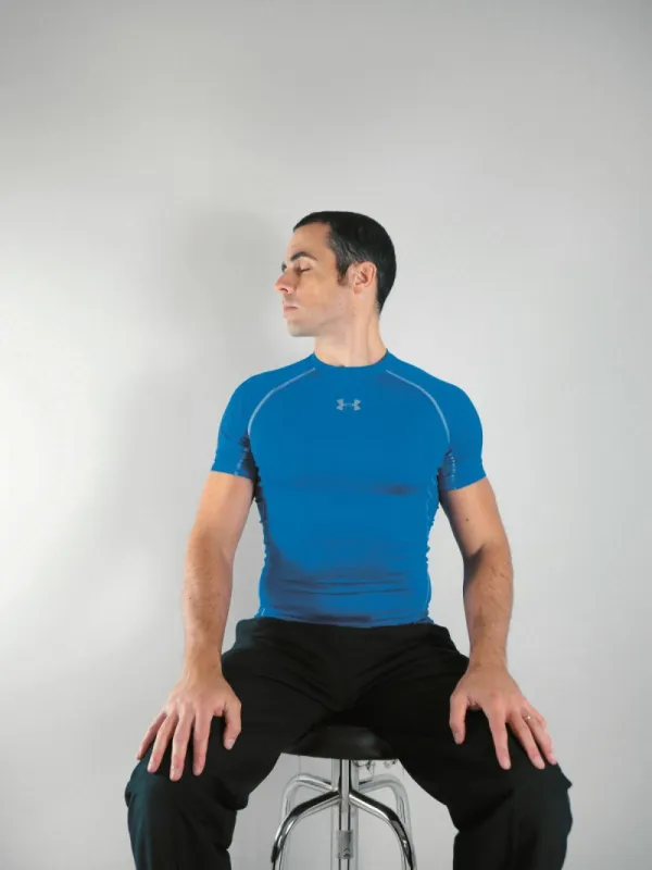Assis sur une chaise retournée (dossier devant vous) ou un tabouret, les deux mains posées sur vos cuisses. Enroulez la tête vers l’avant jusqu’à atteindre votre limite (vous sentez l’étirement mais ce n’est pas douloureux) puis revenez au point de départ. Tirez ensuite la tête vers l’arrière, lentement, jusqu’à étirement complet.
