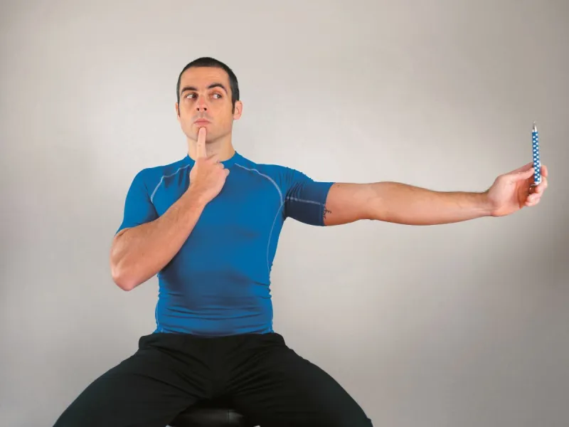 Attention, pendant toute la durée de cet exercice, la tête et la colonne vertébrales doivent rester fixes, ne bouger ni à droite ni à gauche. Posez un doigt sur votre menton et tenez un stylo dans l’autre main, bras tendu ramené devant vous. Ouvrez lentement votre bras vers l’extérieur en suivant le stylo du regard (sans bouger la tête). Ramenez lentement puis changez de main.