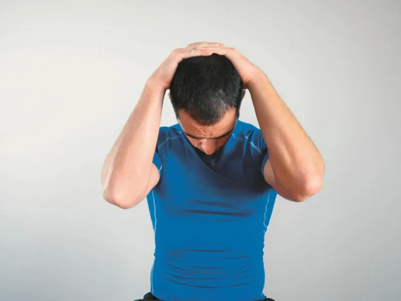 Penchez votre tête à l’avant jusqu’à sentir un très léger étirement. Puis placez vos deux mains croisées à l’arrière de votre crâne et appuyez pour augmenter un peu la tension ressentie. Tenez 10 secondes, revenez à la position de départ et répétez 10 fois.