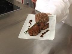 Dans cette recette, l'atelier des chefs coupe son filet mignon de porc en médaillons, pour le cuire à la poêle et le servir avec une sauce au miel, au cacao et au grué de cacao...