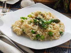 Faire rapidement revenir à la poêle les pointes d'asperges réservées. Verser le risotto dans un plat de service et décorer avec les pointes d'asperges. Déguster bien chaud.