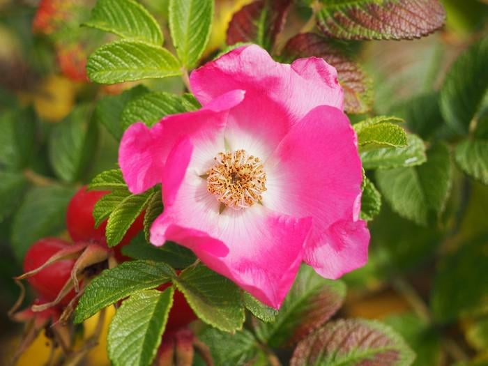 Cette espèce de rosier est convoitée par les phytothérapeutes pour son cynorrhodon, un faux-fruit riche en vitamine C qui renforce les défenses immunitaires. Il a aussi une propriété astringente (il assèche les tissus et accélère la cicatrisation), diurétique (il améliore le fonctionnement de l’appareil urinaire) et antidiarrhéique. Le cynorrhodon du rosier est indiqué dans le traitement de la fatigue, des rhumes, de la grippe et des diarrhées. Il est aussi recommandé aux personnes qui présentent une carence en vitamine C et aux enfants convalescents qui ont souffert d’une maladie infectieuse. Une étude récente vient de révéler que le fruit de l’églantier aurait un effet analgésique et soulagerait les douleurs associées à l’arthrite.