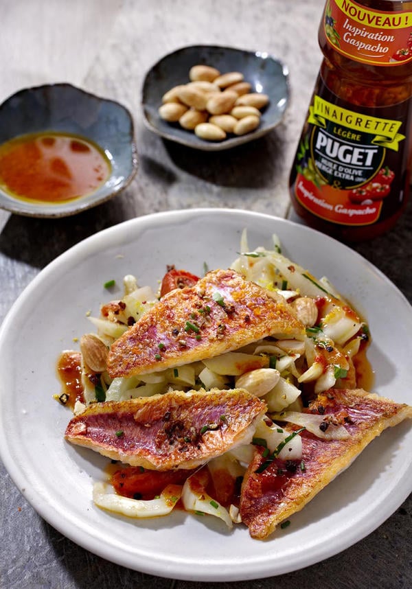 Dressez le fenouil en fond d’assiette chaude, et déposez des filets de rougets. Dans la poêle chaude de cuisson du poisson, versez un filet d’eau, portez à ébullition et ajoutez 3 cuillères à soupe de vinaigrette légère biphasée Puget « Inspiration Gaspacho ».