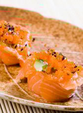 Dans un récipient, mettre à mariner trois petites tranches de saumon fumé avec du vinaigre à la violette. Egoutter et rouler chaque tranche.