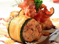 Former des boulettes avec cette préparation et envelopper chacune d'elles dans une lamelle de courgette.