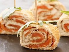 Étaler sur chacune d’abord la Vache qui rit puis une tranche de saumon. Les rouler, les enfermer dans une feuille de film alimentaire et les réserver 30 minutes au frais.