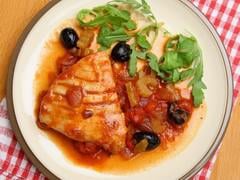 8. Servir dès la fin de cuisson en présentant avec 2 tomates provençales et du chou à la moutarde.
