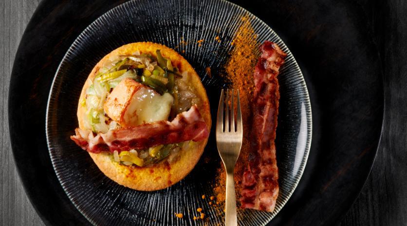 Préparation Sablé de Maroilles à l'oignon et poireau crispies de poitrine de porc