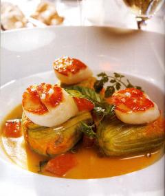 Saint-Jacques poêlées, fleurs de courgettes farcies en marinière de noix de pétoncles
