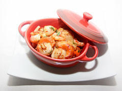 Au dernier moment napper le fond d'une cassolette avec le caviar d'aubergines. Poser dessus 3 noix de St Jacques. Laisser l'une nature et saupoudrer l'autre de piment en poudre ou de paprika.