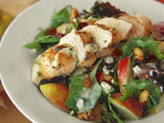 Laver la salade, l'essorer. La mettre dans un saladier avec les noix. Couper les pommes en fines lamelles. Faire cuire les filets de poulets coupées en lamelles. Mélanger le tout une fois que le poulet est bien refroidi. Ajouter un filet d'huile d'olive et de vinaigre balsamique.