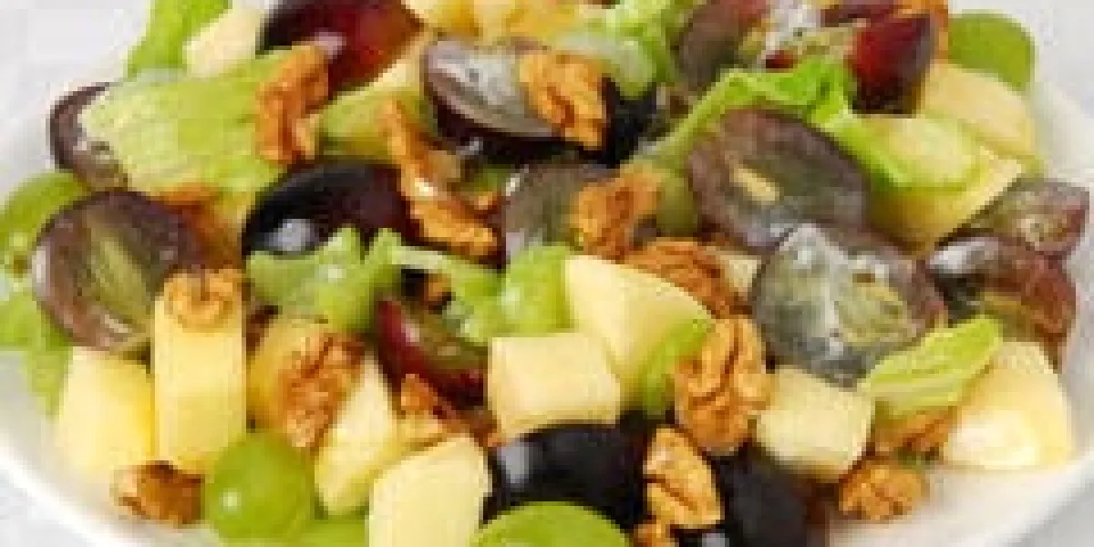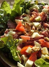 200 g de salade mélangée, 200 g de saucisse sèche, 200 g de fourme d'Ambert, 200 g de champignons de Paris, 200 g de trompettes de la mort, 12 cerneaux de noix, 8 tomates cerises, un peu de pain rassis, 1 cuillère à café de moutarde à l'ancienne, 2 cuillères à soupe de vinaigre, 3 cuillères à soupe d'huile de tournesol, 1 cuillère à soupe d'huile de noix, 1 cuillère à soupe d'huile d'olive, jus d' ½ citron, 1 gousse d'ail, sel et poivre.