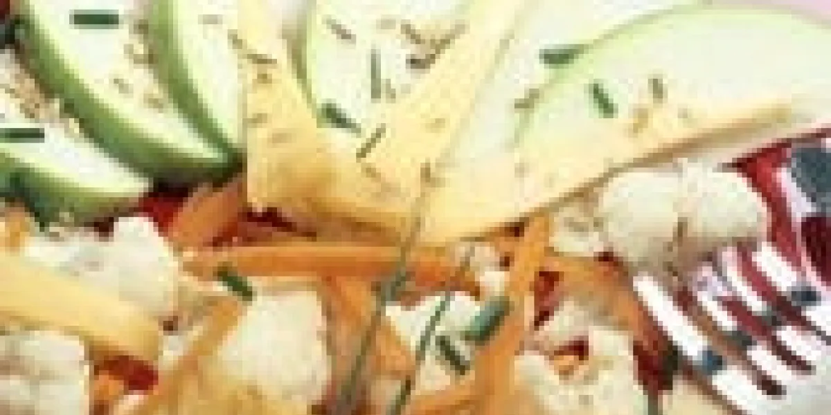 Mettez dans un saladier successivement la laitue, les pousses de soja, les rondelles de concombre, les dés de poulet et de tomate.