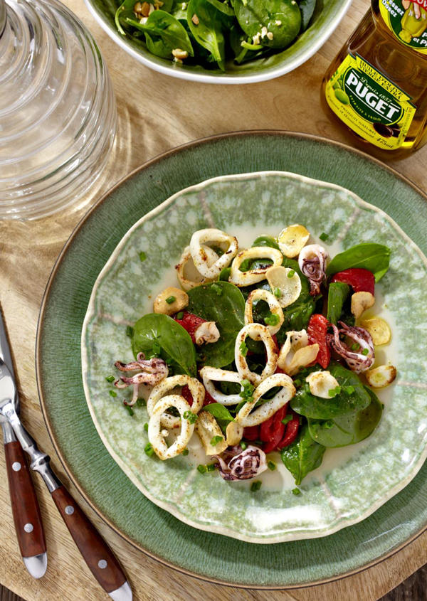 Détaillez les calamars en anneaux de 1 cm. Dans une poêle chaude versez deux cuillères à soupe d’huile d’olive Puget classique et faites-les revenir rapidement.