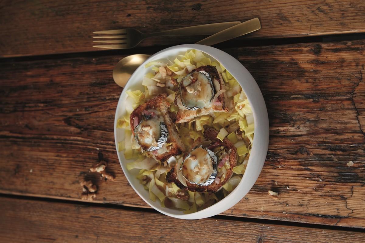 10-Ajoutez les cerneaux de noix et déposez les toasts sur la salade d’endives.