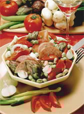 400g de fèves, 4 artichauts poivrade, 8 tranches de saucisson à l'ail, 4 tomates, 1 petit bouquet de persil, 1 gousse d'ail, 2 échalotes, 3 cuillères à soupe d'huile d'arachide, 2 cuillères à soupe de vinaigre, sel, poivre.