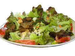 11. Dans un saladier ou une grande assiette de service, dresser la laitue, verser les haricots verts, le contenu de la poêle, les tomates, les cerneaux de noix, arroser avec la sauce. Mélanger.