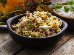Dans un saladier, mettre les légumes cuits avec l'huile, les tomates coupées en morceaux, les olives vertes, les dés de jambon. Verser le riz, remuer, saupoudrer de basilic et mélanger.