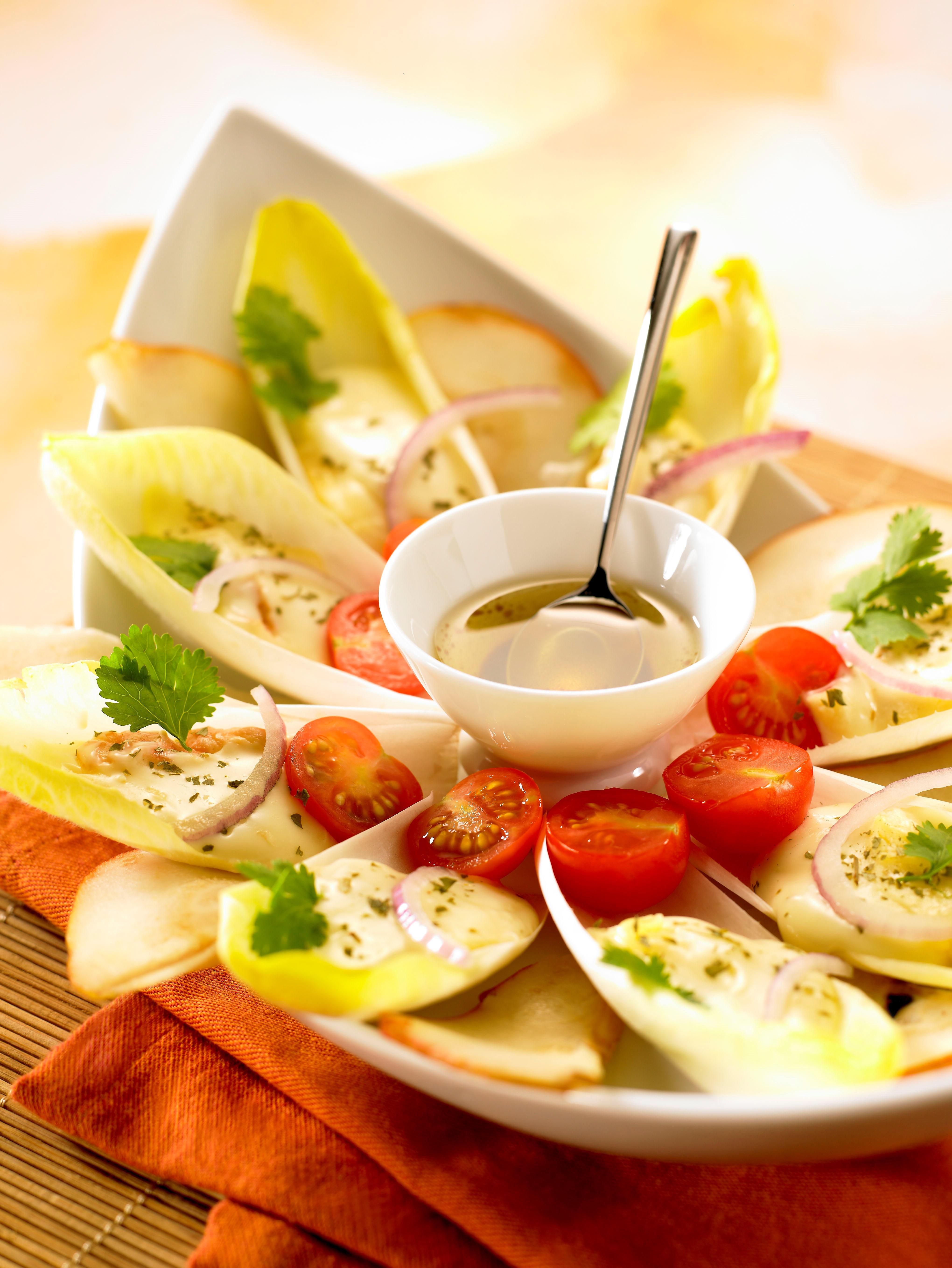 6- Surmontez chaque feuille d’endive d’une portion d’Epoisses Berthaut, d’émincés d’oignon rouge et d’une tomate cerise puis assaisonnez avec la vinaigrette.
