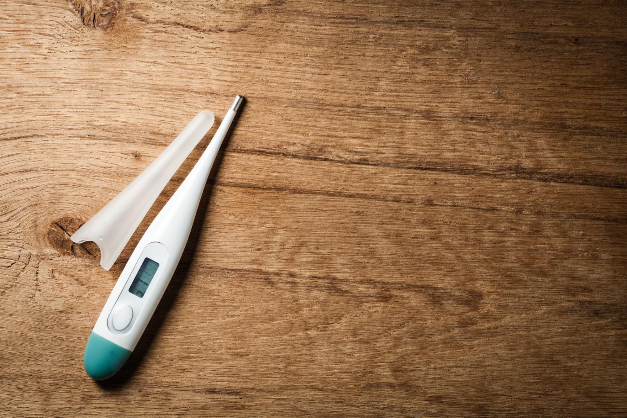 gros plan médical de thermomètre électronique sur la fièvre de fond en bois