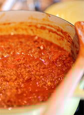 Laisser mijoter à très petit feu pendant 1 heure et demie en remuant de temps à autre. Si la sauce réduit trop vite, ajouter un peu d'eau, ou mieux, du bouillon.