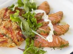 11. Dresser dans les assiettes, les galettes de quinoa, le saumon, la salade et finir par la sauce.