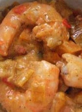 24 scampis, 1 échalote, 1 gousse ail, une demi courgette, 1 blanc de poireaux, 2 tomates, 100 gr de champignons, un quart de poivron, 50 gr lardons fumés, sel, poivre, paprika, 15 cl vin blanc et 10 cl de whisky pour flamber.