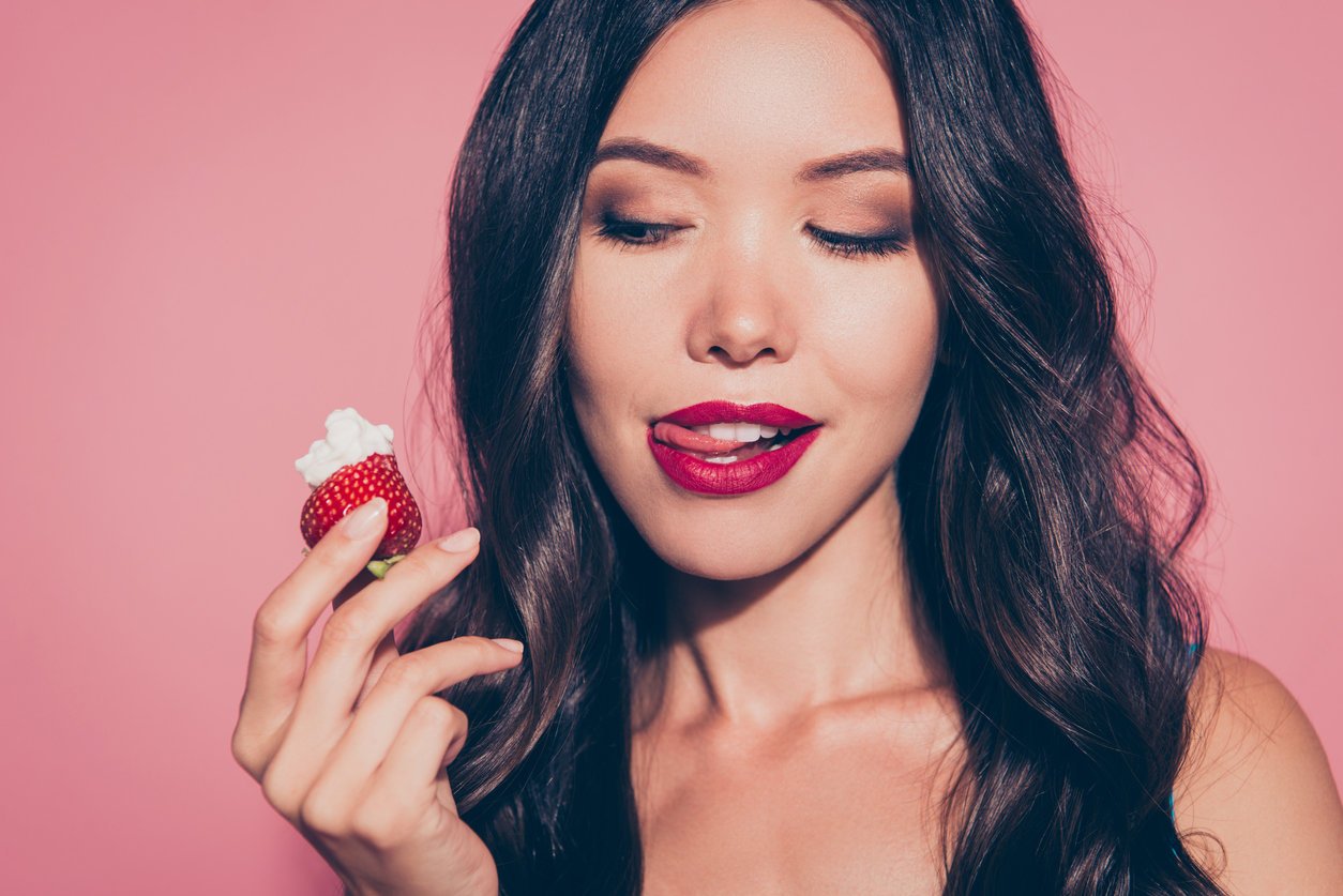 close-up portrait of nice cute luxury lovely sweet attractive adorable wavy-haired lady licking red lips want wish looking at whipped cream dessert isolated over pink pastel background
