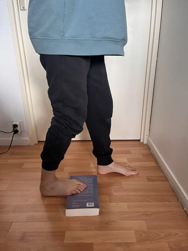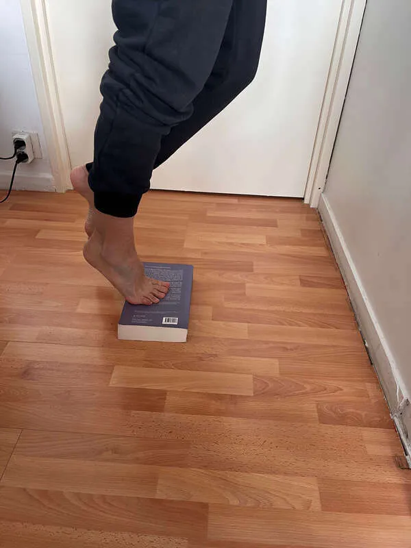"Placez l’avant-pied posé sur un livre épais. En laissant les deux tiers du pied dans le vide, laissez le talon descendre vers le sol jusqu’à ressentir un étirement sur l’ensemble du mollet", souligne-t-il.