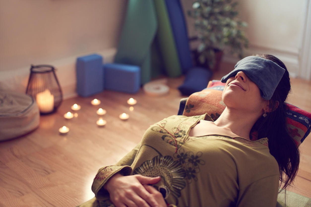 dame sereine se détendre et méditer sur un tapis de yoga dans une maison confortable