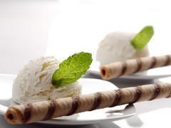 Une fois que le sorbet est pris, former deux boules et les mettre dans une coupe. Découper le kiwi restant en tranche et déposer une ou deux rondelles sur chaque coupe.