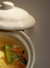 Coupez le galanga en rondelles en 5 cm d'épaisseur. Portez le lait de coco à ébullition, ajoutez-y la racine de citronnelle, les feuilles de citronnier, le galanga et laissez frémir le tout à feu moyen pendant 15 min.