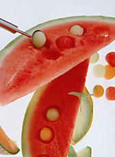 Pendant ce temps de pause, préparer la décoration en prélevant des boules de melon dans les moitiés de melon restantes. Au moment de servir, garnir chaque assiette de petites boules de fruits et de brins entiers de menthe.