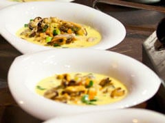 2 l de moules, 1 blanc de poireau, 1 oignon moyen, 2 pommes de terre, 1 bouquet garni, 1 gousse d'ail, 2 dl de vin blanc sec, 1 petite cuillère à café de curry en poudre, 9 dl de crème liquide, 50 g de beurre, 2-3 brins de persil plat, sel et poivre, quelques croûtons.