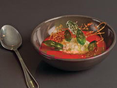 Dans quatre assiettes creuses, déposer une louche de soupe de fraises.