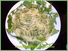 Présentez les spaghettis recouvertes de pesto, vous pouvez accompagner de roquette.