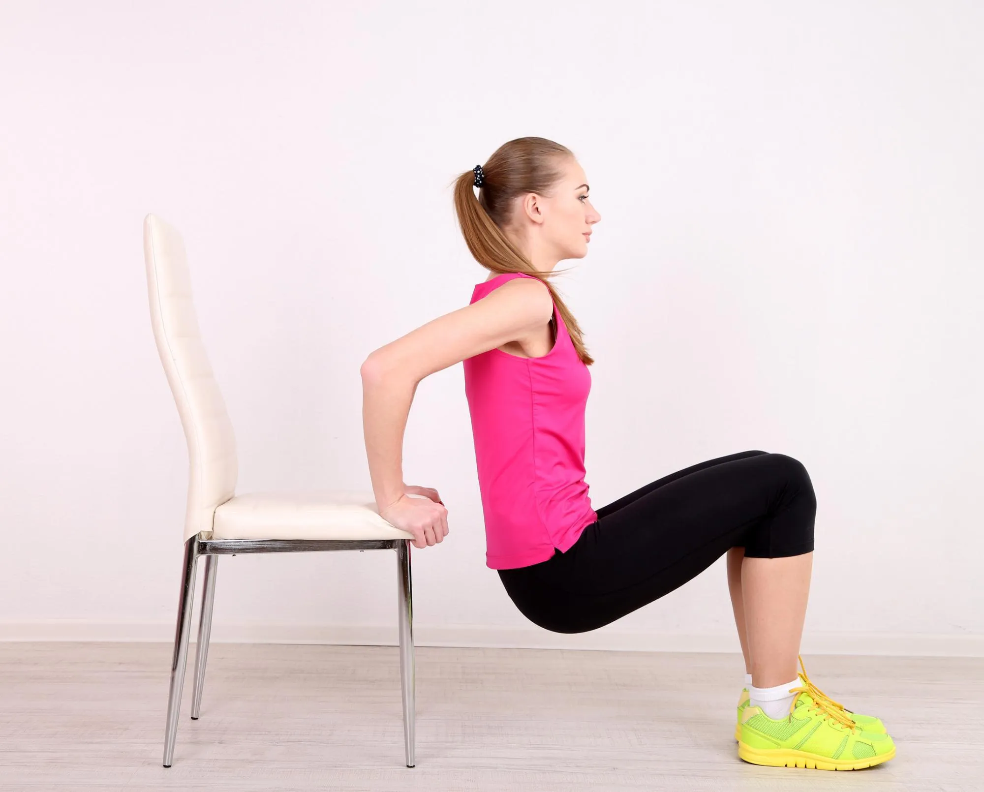 L'exercice : Mettez-vous devant la chaise, pliez vos jambes à 90°c en gardant les pieds bien à plats sur le sol et posez les mains sur le bord de la chaise. Gardez le dos droit puis descendez le bassin le plus bas possible avant de remonter avec la force de vos avant-bras. Inspirez quand vous descendez et soufflez quand vous remontez.