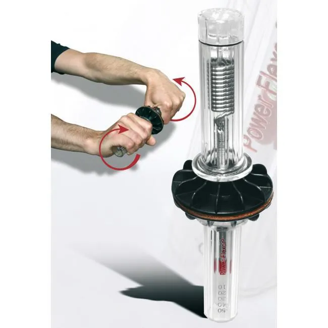 Comment : debout, le dos droit, tenir le Power-Flexor dans les deux mains, bras tendus. Faire tourner les poignées dans des directions opposées. La vis permet de régler la résistance à vos besoins. Faire des séries continues de 20 secondes. Reposer les mains, secouer les bras et recommencer une série en allant plus vite. Le mieux est de commencer en faisant l'exercice 1 minute par jour puis d'augmenter la durée quand on est plus à l'aise.