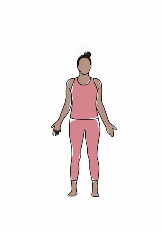 Rien de plus simple ! Débout, écartez les pieds à la largeur des hanches. Rentrez légèrement le coccyx, ouvrez la poitrine et relâchez les épaules vers l’arrière et le bas. Laissez vos bras pendre le long du corps, la paume en avant.
