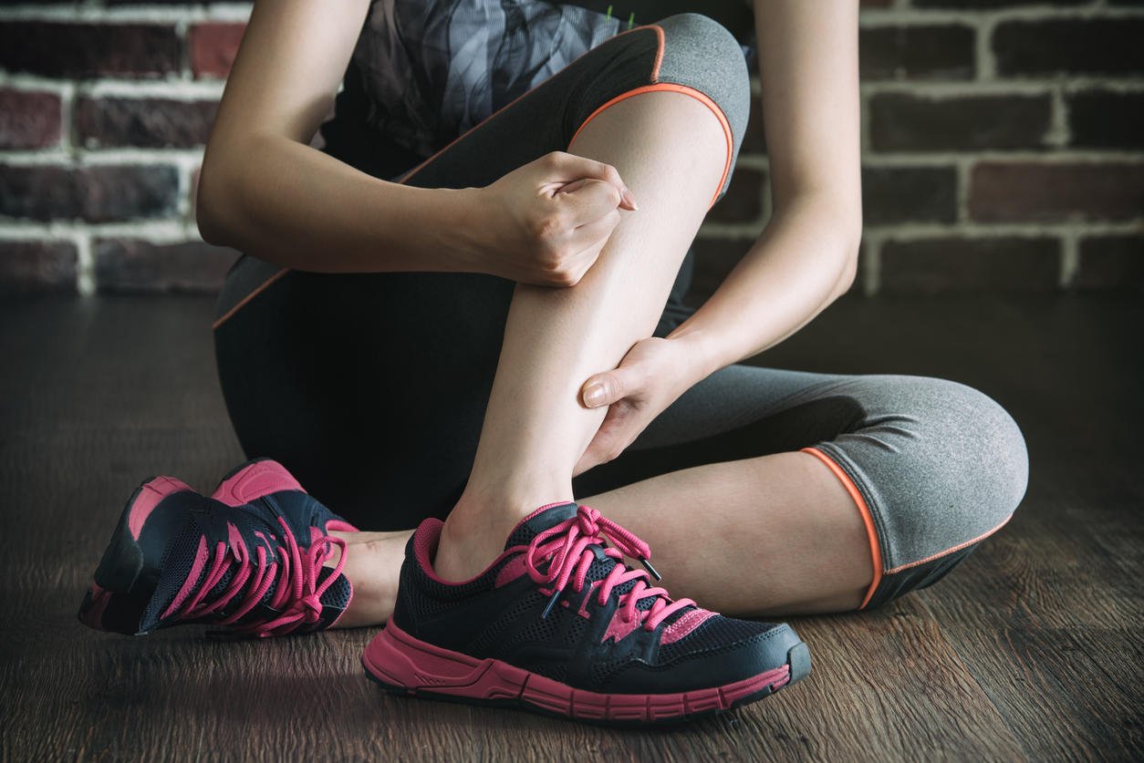 have a leg cramp in fitness exercise training, healthy lifestyle concept, indoors gym wooden floor brick wall background