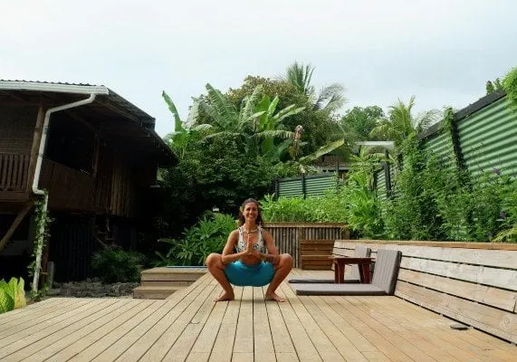 - S'accroupir tout doucement comme pour faire un squat. Si les talons peuvent toucher le sol, ramener les paumes de main en prière devant son cœur. Si les talons ne peuvent pas le toucher, mettre une couverture sous les talons ou des blocs et placer les doigts sur le sol ou en prière.